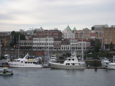 This is Victoria, as viewed from my ferry. Two violinists were playing music on the ferry. They were passengers and simply did so to terrify me and two German tourists whom I bugged during the ride over. It terrified us because the Coast Guard rode next to the ferry with a huge weapon manned by a man on the helm. Uh... We had visions of the Titanic and the violin music was played there, too.